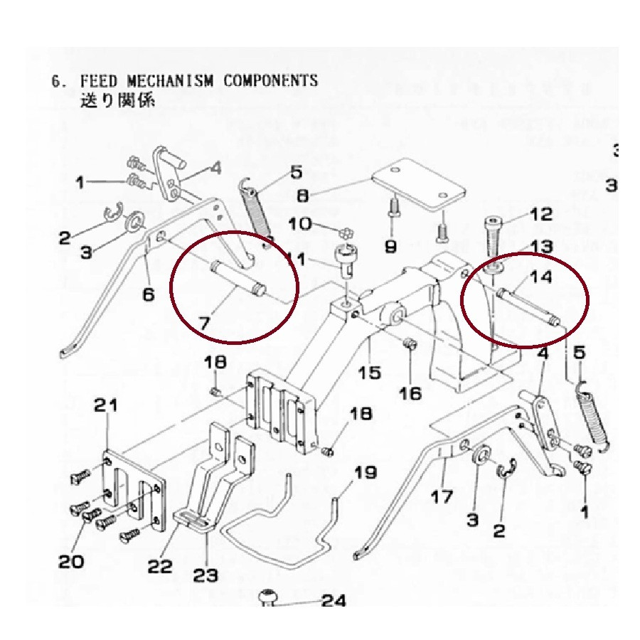 Juki reteszelő talpmozgatáshoz csatlakozó alkatrészek. A képen látható 14-es számú hosszabb, fém emelő csap #135-18501, a 7-es számú zömökebb, rövidebb sötét színű csap #135-18105