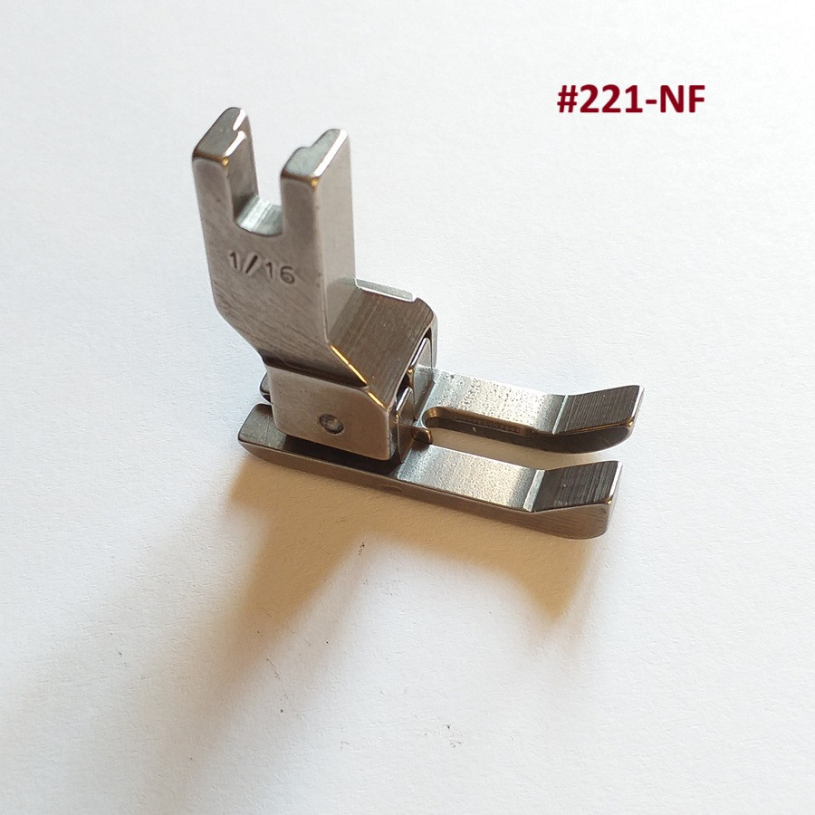 Pfaff 461, Pfaff 481-es, Dürkopp 272, Juki DLM-522-es típusú tűtolásos varrógépekhez alkalmazható, balos, kompenzációs 1/16"-es (1,6mm) méretű tűzőtalp. #ART1649/3-1/16; #221-NF